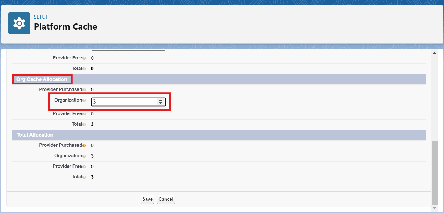 5. Click on the edit and change the allocated capacity to "3" in the Organization field under the section of Org Cache Allocation and save it.